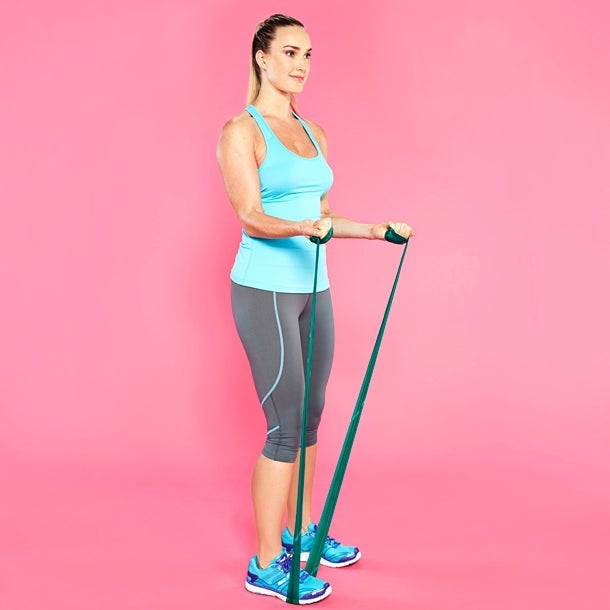 How-to: Sit on the floor with your back straight and knees bent. Place the band around your feet and wrap the ends around your palms. Lengthen your spine, keep your chin tucked in and core engaged, and draw your elbows back in a rowing motion. Squeeze shoulder blades in at the end of each row. Repeat.