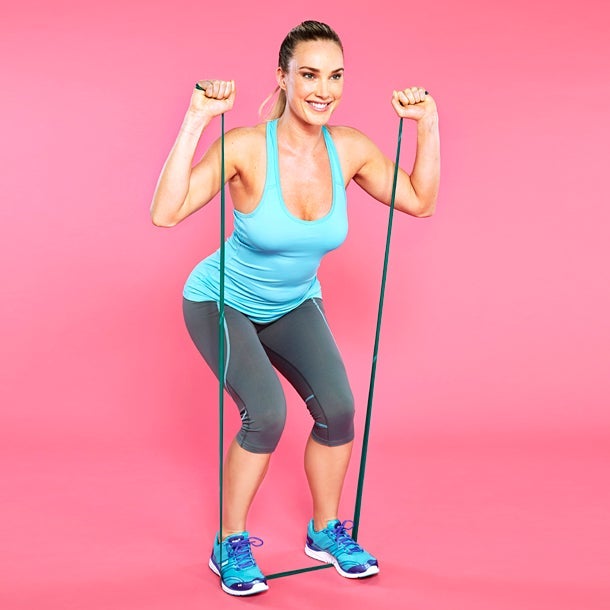 How-to: Stand with feet hip-width apart and place the band under your feet. Hold the ends of the band in your hands, bring your hands to shoulder height and wrap the ends around your palms until you feel tension. Keep your back flat and hands in place as you bend your knees and elbows and sit into a squat position. Lower down so your thighs are as close to parallel to the floor as possible. Press through your heels and come back to stand. Repeat.