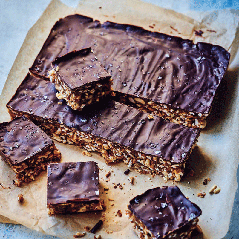 Microwave chocolate in a microwave-safe bowl on High (100%) in 30 second bursts, stirring, until smooth and melted. Spread over slice and sprinkle with sea salt. Refrigerate for about 3 hours, or until slice is firm. Lift from tin and cut into 16 pieces.