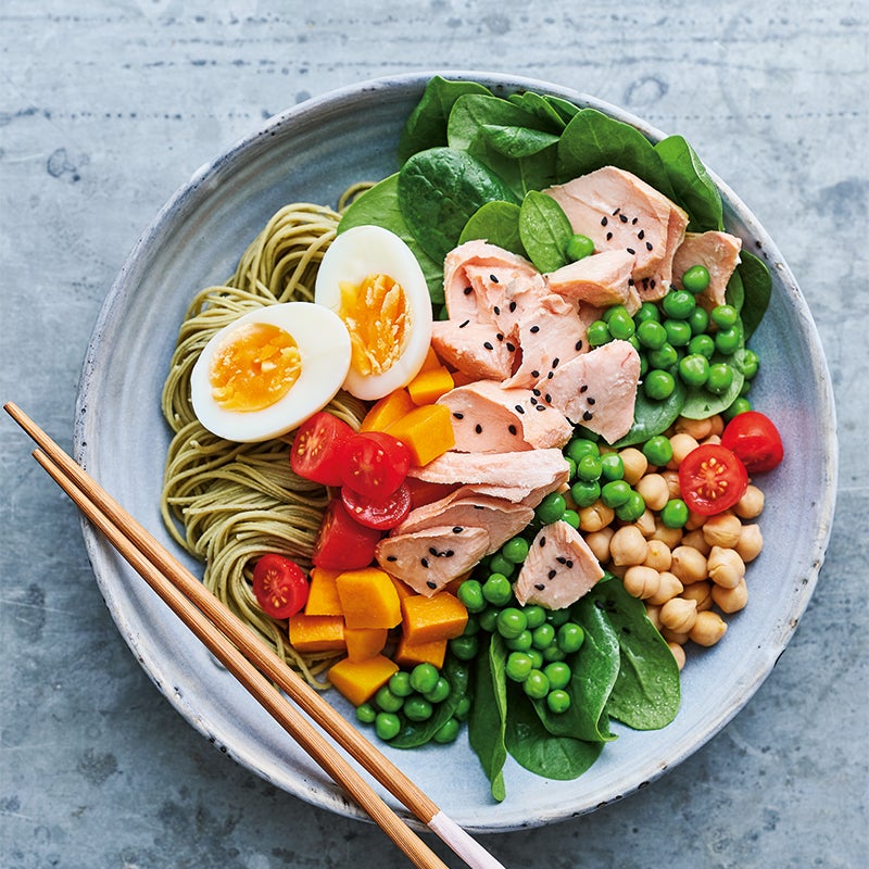 Arrange spinach, pasta, steamed vegetables, egg, tomatoes and chickpeas in a bowl. Flake salmon and add to bowl. Serve sprinkled with sesame seeds.