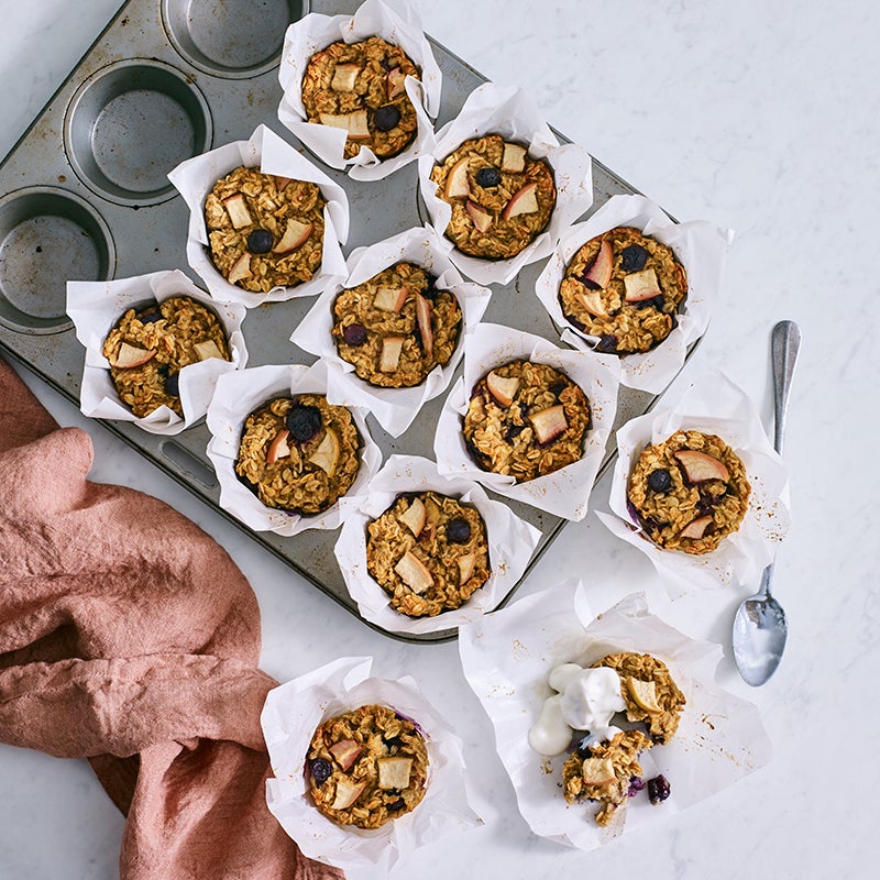 Chop remaining apple into small pieces, scatter over tops and lightly press into the mixture. Bake for 25–30 minutes, until a skewer inserted into the centres comes out clean. Stand oat cups in tray for 5 minutes, then transfer to a wire rack. Serve warm or cooled.