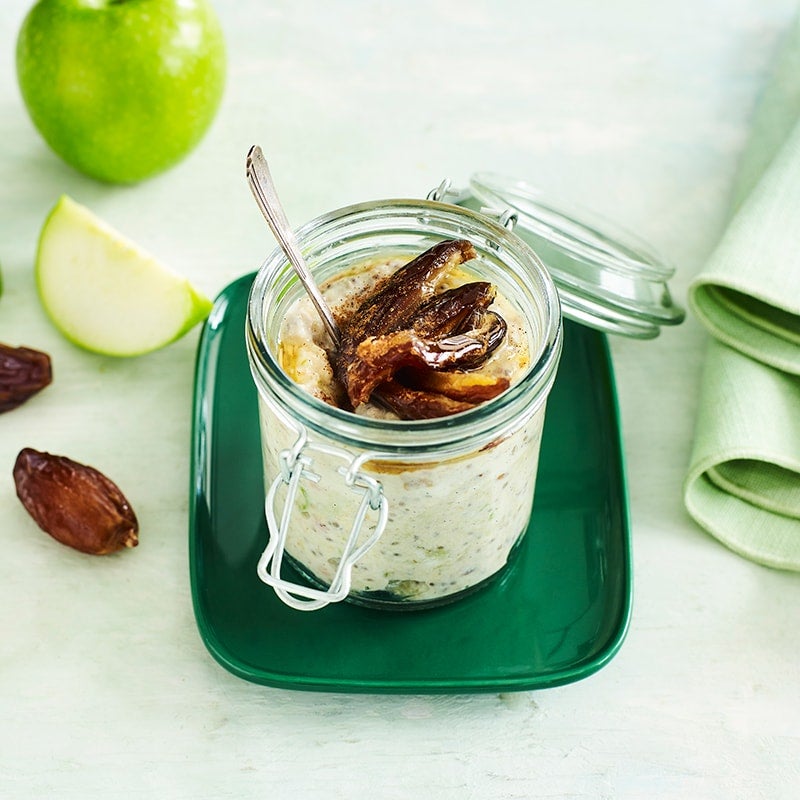 Combine milk, yoghurt, vanilla, apple purée, oats, apple and half the dates in a medium bowl. Spoon mixture into a 1¼-cup (310ml) capacity jar, glass or reusable container. Cover and refrigerate overnight.