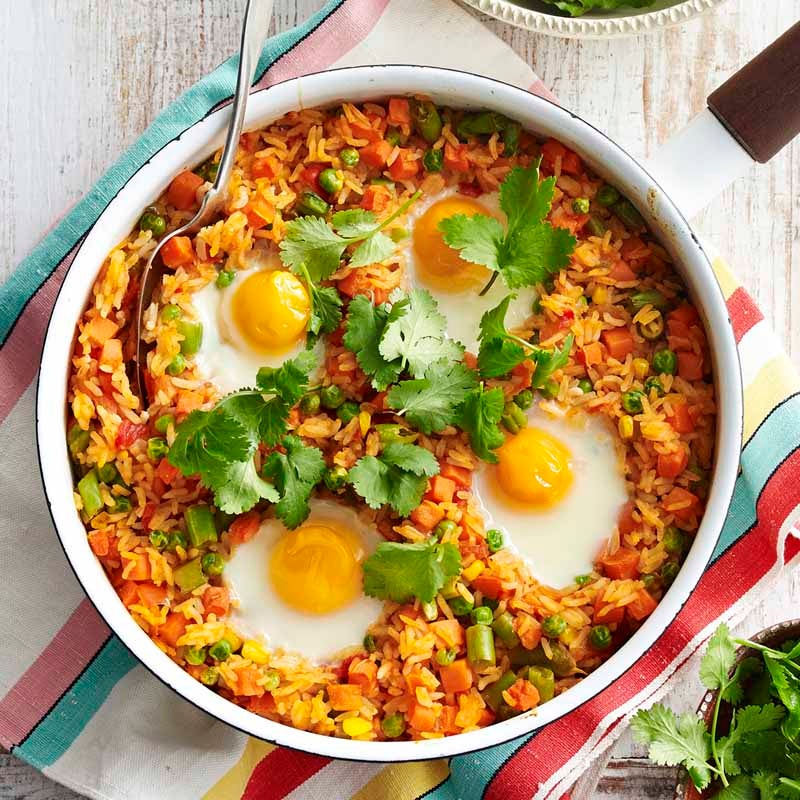 Spray a large non-stick ovenproof frying pan with oil and heat over high heat. Cook the rice, salsa and vegetables, stirring, for 5 minutes or until heated through. Remove from the heat. Use a spoon to make 4 indents in the rice mixture. Carefully crack an egg into each indent.