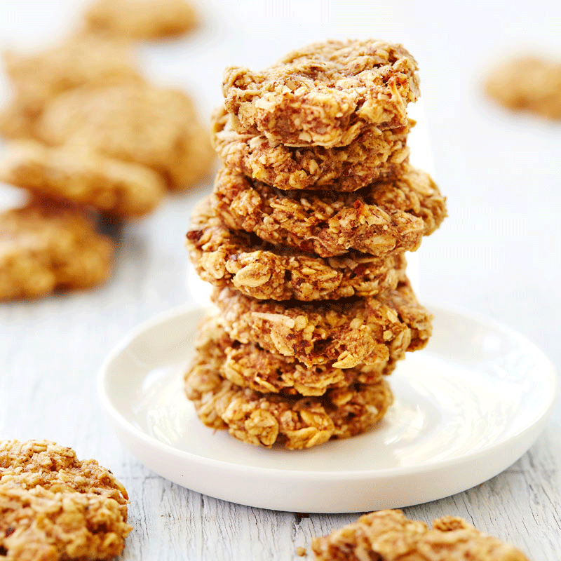 Using ripe bananas and a dash of vanilla and maple syrup as your moist ingredients for these little oat biscuits is genius, it gives them great flavour.