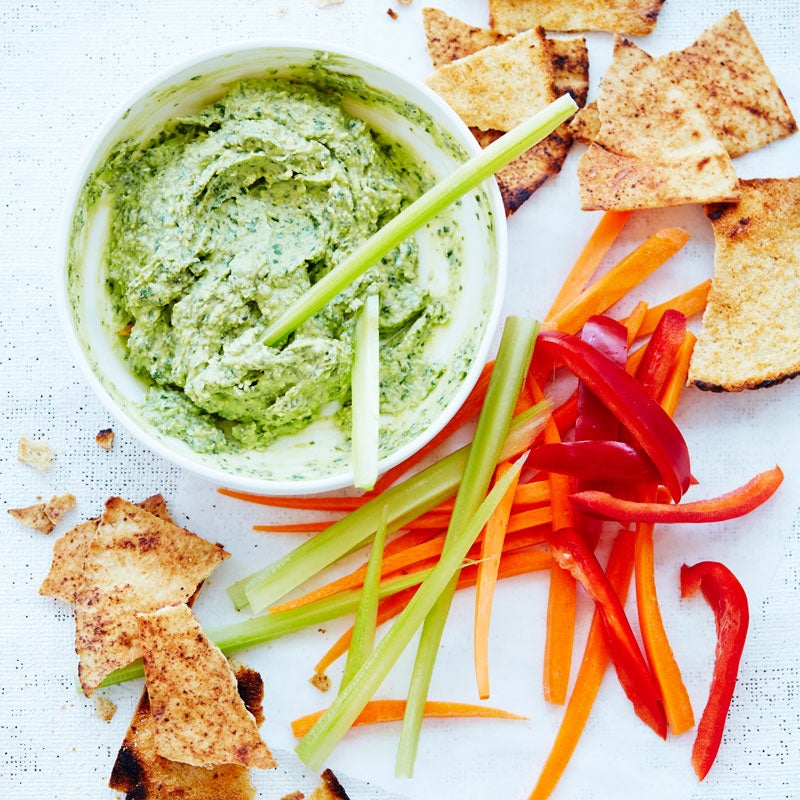 Basil, bean and feta dip with pita chips