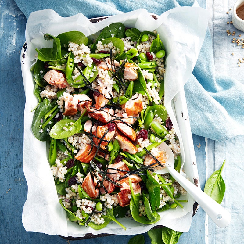 Meanwhile, lightly spray a chargrill or barbecue with oil and preheat over medium-high heat. Cook salmon for 2–3 minutes each side or until cooked to your liking. Transfer to a plate. Cover salmon with foil and set aside to rest for 5 minutes before flaking.