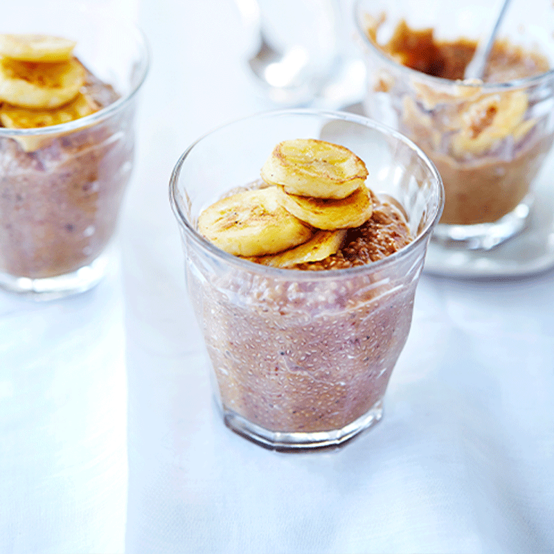 Lightly spray a non-stick frying pan with oil and heat over medium heat. Cook banana for 1 minute each side or until golden. Top chia mixture with banana to serve.