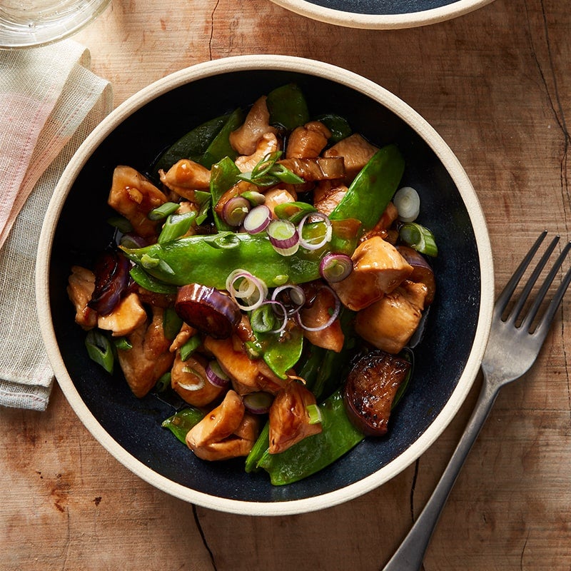 Whisk the reserved sauce mixture until smooth, then add to wok along with snow peas, shallots and reserved chicken. Cook, stirring, 1-2 minutes or until sauce boils and thickens and peas are just tender. Serve sprinkled with eschalot.