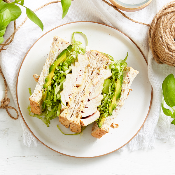 Spread bread with mustard. Sandwich chicken breast, celery, lettuce and avocado between bread slices.