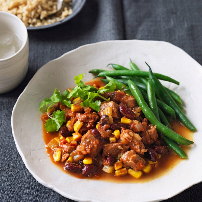 Hearty slow-cooked dishes are so perfect for winter-time cooking and the chilli that’s added to the pork and beans gives this classic combo a Southern American-style twist.