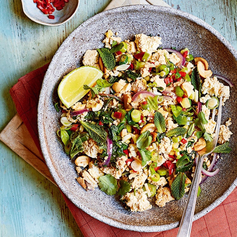 Crumbled firm tofu makes an excellent meat-free substitute for the pork mince you’d usually find in larb as it takes on the spicy, zesty flavours in this classic Thai salad with great results.