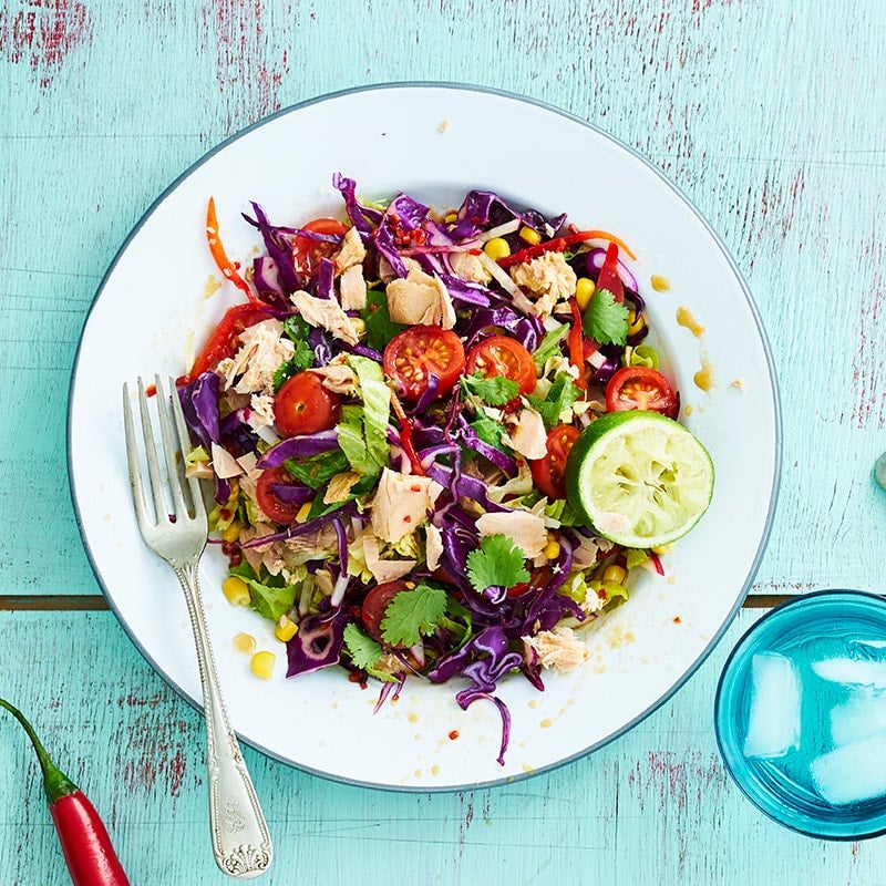 Combine corn, cos, cabbage, tomato, capsicum, radish, coriander and tuna in a large bowl.