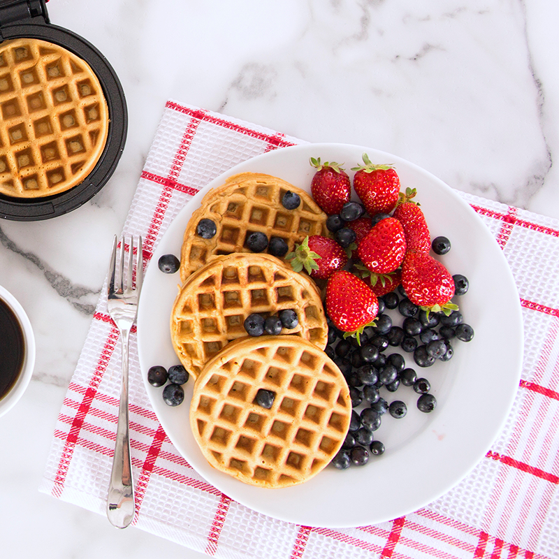 Slowly pour ¼ cup batter onto the bottom Cooking Surface of the WW Mini Waffle Maker. Use the Cover Handle to pull the Cover down and enclose waffle. Cook for 2-3 minutes, until golden brown and cooked through. Using a silicone spatula, transfer waffle to a plate and cover to keep warm. Repeat with remaining batter to make 8 waffles in total, lightly spraying Cooking Surfaces with oil again halfway through. Serve.