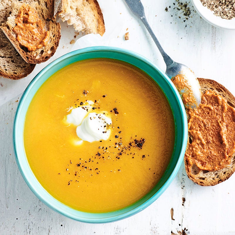 Cream of kumara soup with tomato pesto toasts