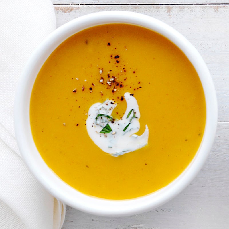 Tikka masala gives a fast flavour hit to this rich vegetable soup. A swirl of coconut milk and natural yoghurt adds some creaminess, while coriander makes it fresh