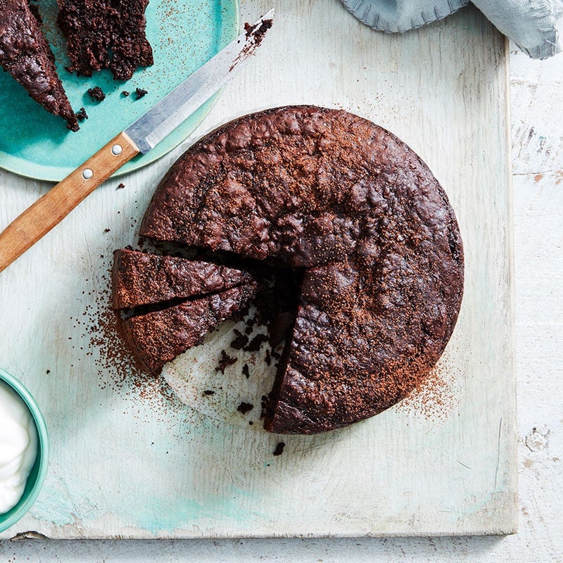 Bake for 30 minutes or until a skewer inserted into the centre comes out clean. Set cake aside in tin for 10 minutes before transferring to a wire rack to cool. Dust with cocoa powder and serve with a dollop of yoghurt.