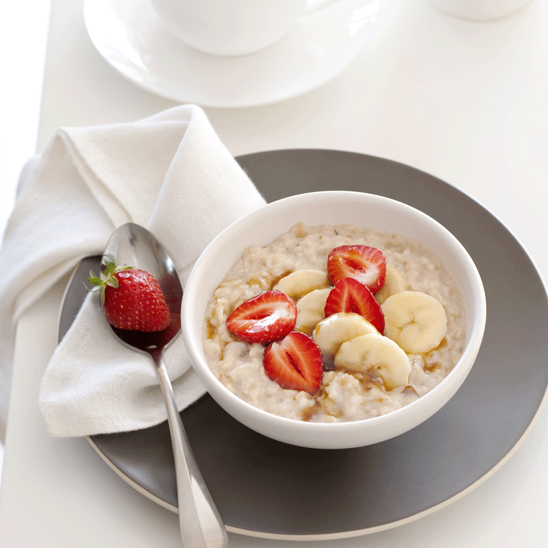 Creamy oat porridge topped with sliced fruit and a drizzle of rich maple syrup is a great way to start your day.