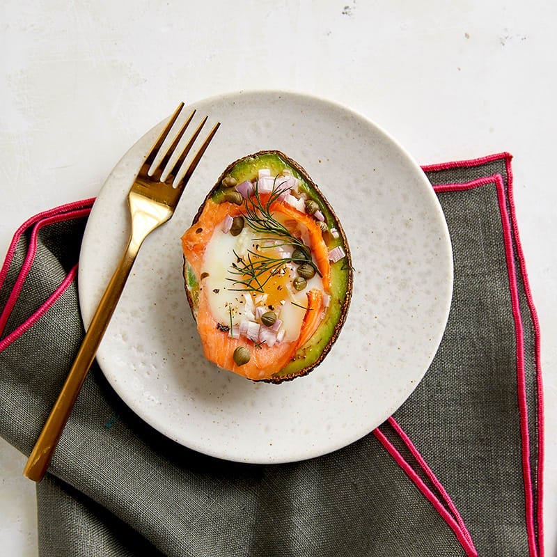 All the yumminess you'd expect on a smoked salmon platter is baked into a hollowed-out avocado half. Scoop out a bit of the avocado from each half to create a cavity large enough to accommodate the egg while it bakes. Mash the avocado flesh that you removed with a bit of fresh lime juice in a small bowl and press a piece of plastic wrap directly on the surface before refrigerating it to keep it from oxidizing. Enjoy it later with raw vegetables or as a sandwich spread. The salmon and avocado warm through as the egg cooks to become the perfect counterpoint to the flavourful fresh garnishes—shallot, capers, dills, and cracked black pepper.