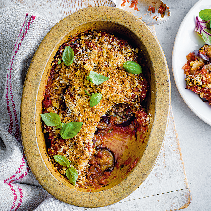 Preheat oven to 200°C. Divide one-third of the tomato mixture between 2 ovenproof dishes. Top with half the eggplant slices. Spread with another third of the tomato mixture, followed by the remaining eggplant slices and the remaining tomato mixture. Combine breadcrumbs and cheese and scatter evenly over the top of each dish. Bake for 25 minutes or until golden and bubbling.