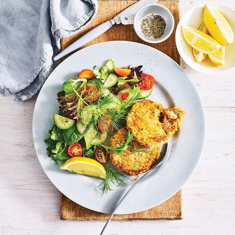 Potato and salmon fish cakes filled with sweet potato, lemon zest and fresh dill.