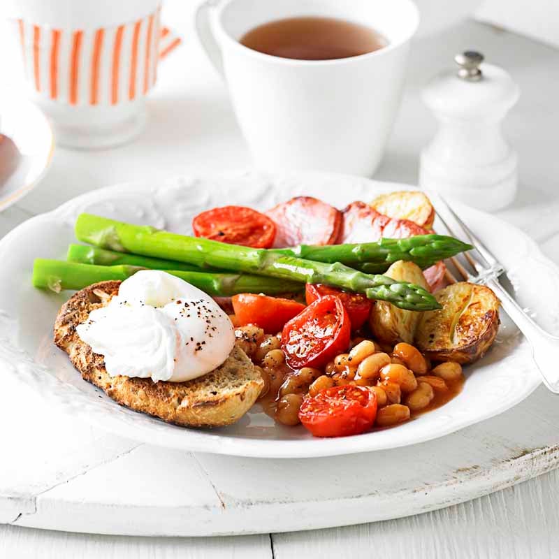 Grill or toast bread on both sides until lightly browned. Top toast with poached eggs and sprinkle with freshly ground black pepper. Serve with baked beans, bacon, asparagus and roasted potatoes and tomatoes.