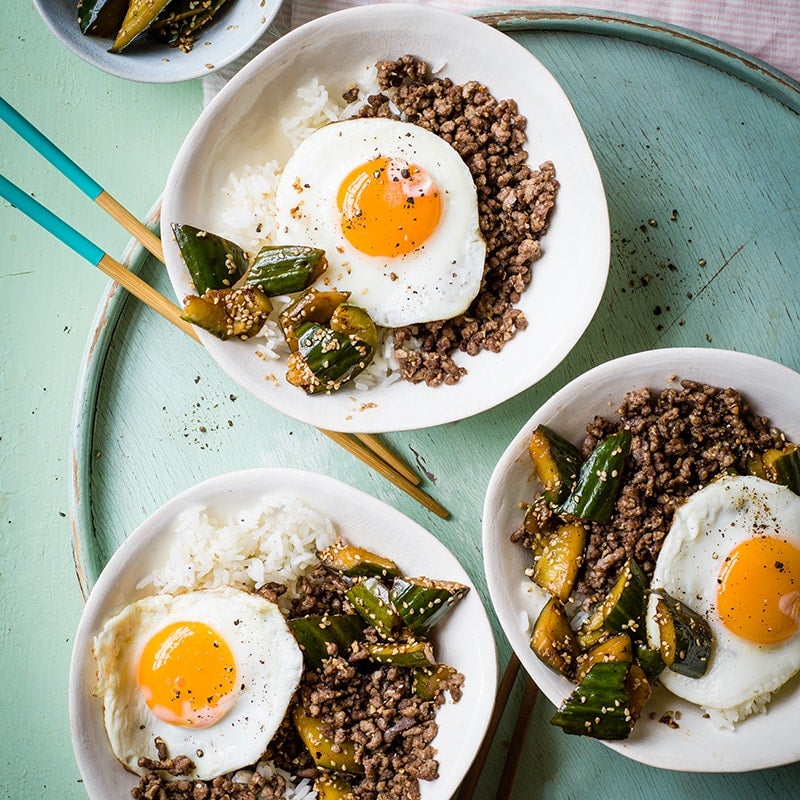Serve rice with beef stir-fry, a fried egg and cucumber.