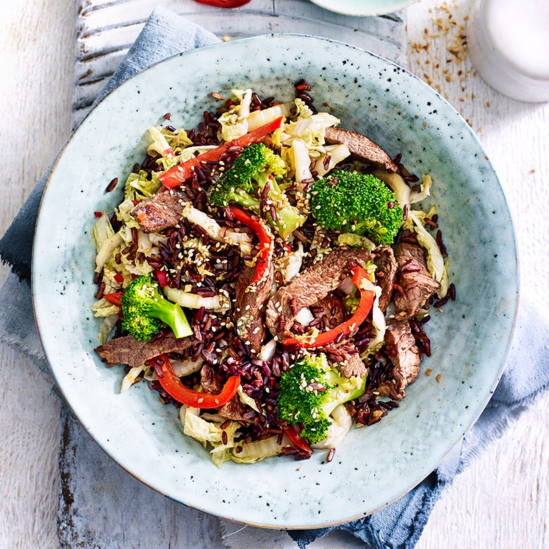 Return beef to wok with rice, sesame oil and soy sauce. Stir-fry for 2 minutes or until heated through. Serve sprinkled with sesame seeds.