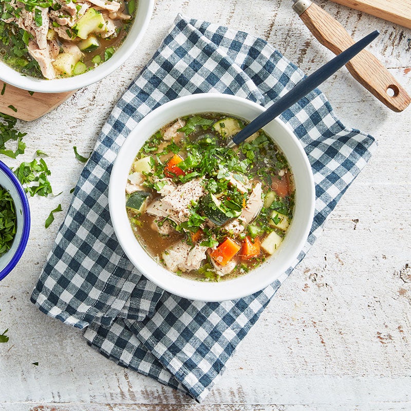 Transfer chicken to a clean board and set aside to cool slightly. Shred chicken with 2 forks and return to soup. Serve sprinkled with parsley.