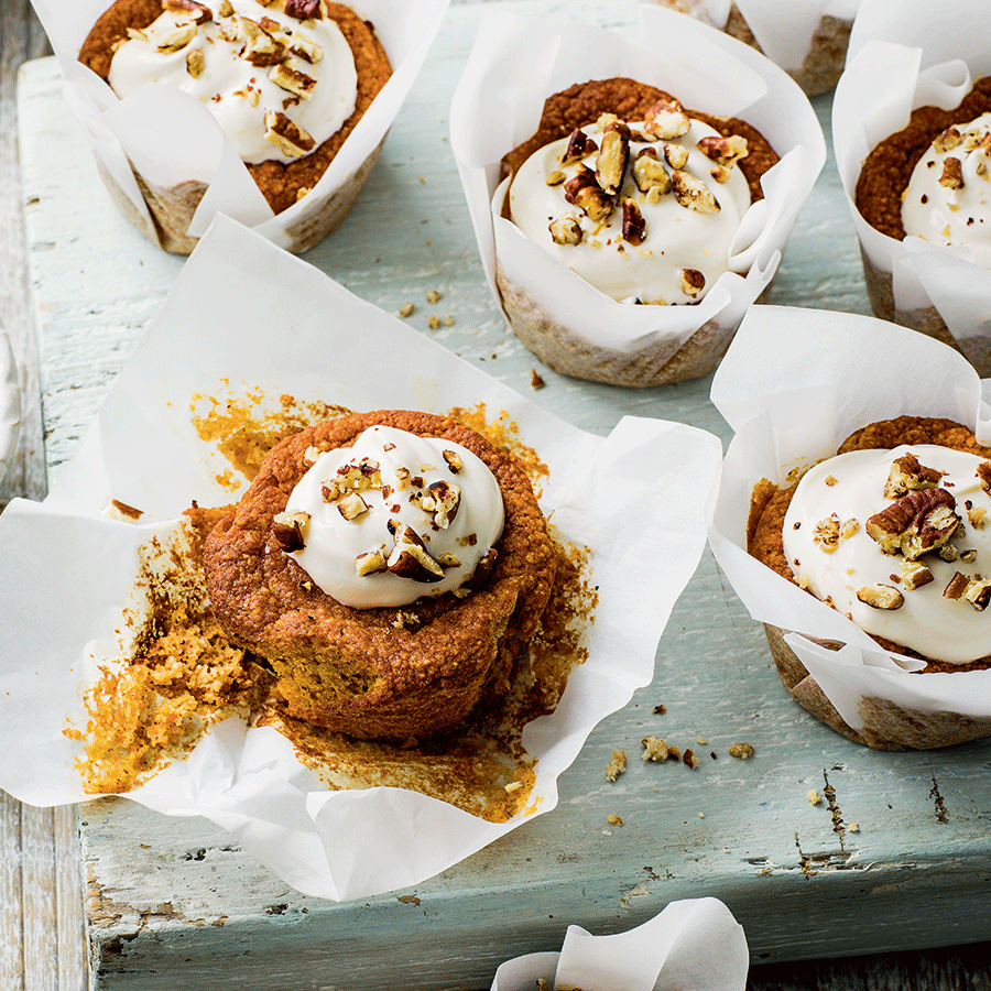 To make maple yoghurt topping, stir yoghurt and syrup in a small bowl until just combined. Spoon onto the cooled muffins. Sprinkle with chopped pecans.