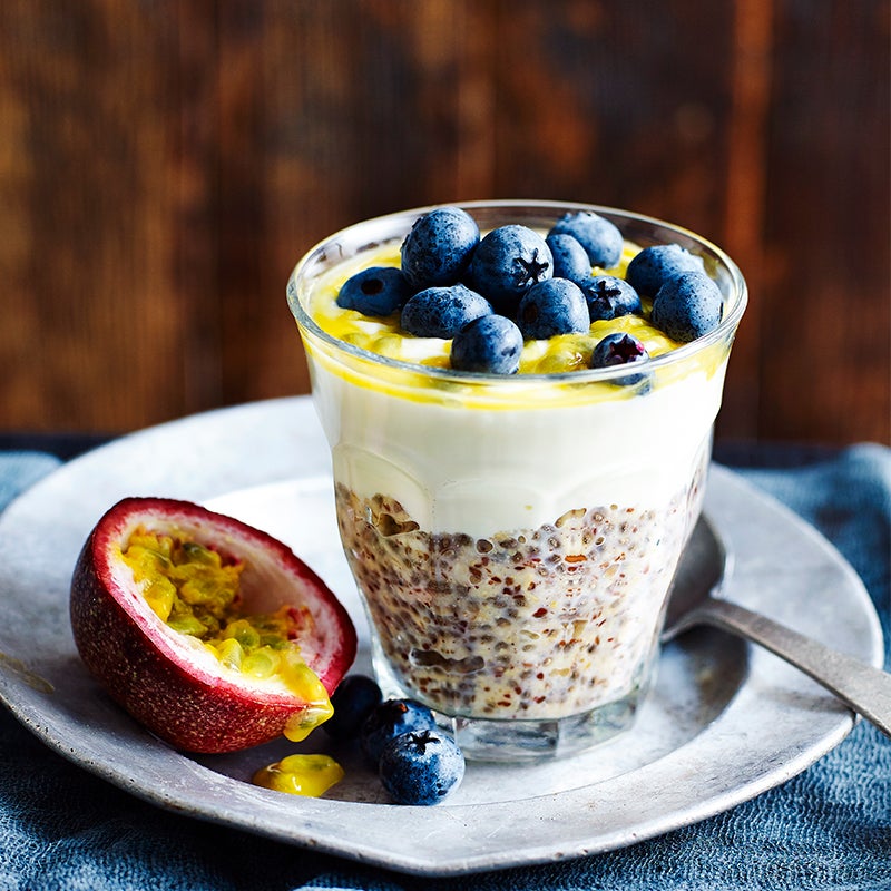 Blueberries are full of antioxidants and give this quick creamy pot of goodness a pop of freshness. You can prepare the oat mix the night before, divide into glasses, cover and refrigerate, then simply top with yoghurt and fruit in the morning to serve.