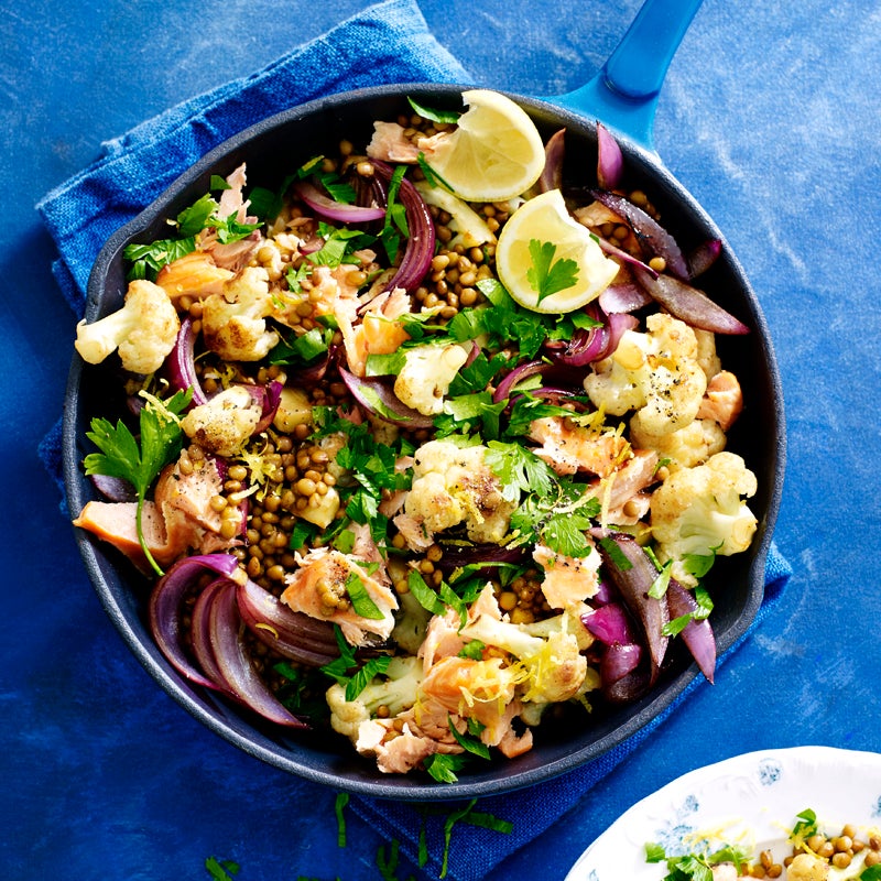 Return cauliflower to pan with lentils. Cook over medium heat, stirring, for 1–2 minutes or until hot. Season to taste. Toss through lemon zest and juice, salmon and parsley. Serve with lemon wedges.