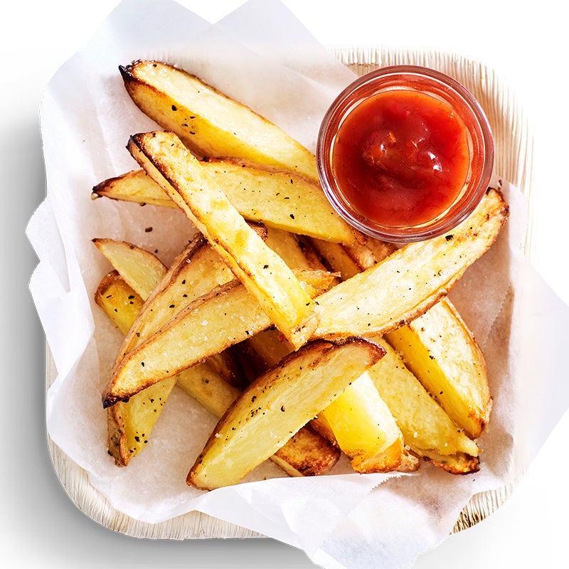 Boil potatoes until almost tender. Drain and cut into thick chips. Place chips on an oven tray lined with baking paper. Generously spray with oil and season well with salt and pepper. Bake in a hot 220°C oven for 30-40 minutes or until golden and crisp. Serve with a tomato relish.
