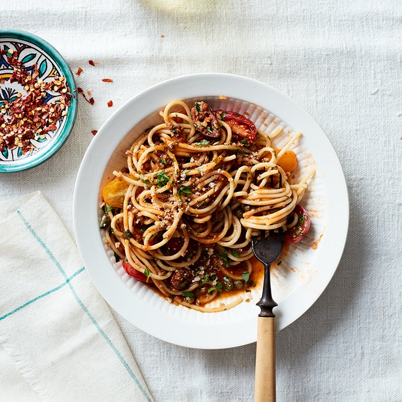 Serve this classic Italian puttanesca recipe with a rocket and tomato salad or simple, seasoned, roasted vegetables. The quick-prep pasta sauce, which features tomato paste, anchovies, cherry tomatoes, olives, and capers, cooks in the time it takes to boil the water and cook the pasta. For the best results, try to time it so you’re draining the pasta when the sauce is ready; you're going to need that pasta cooking liquid to create a glossy, starchy, delicious sauce, so be sure not to drain it all.