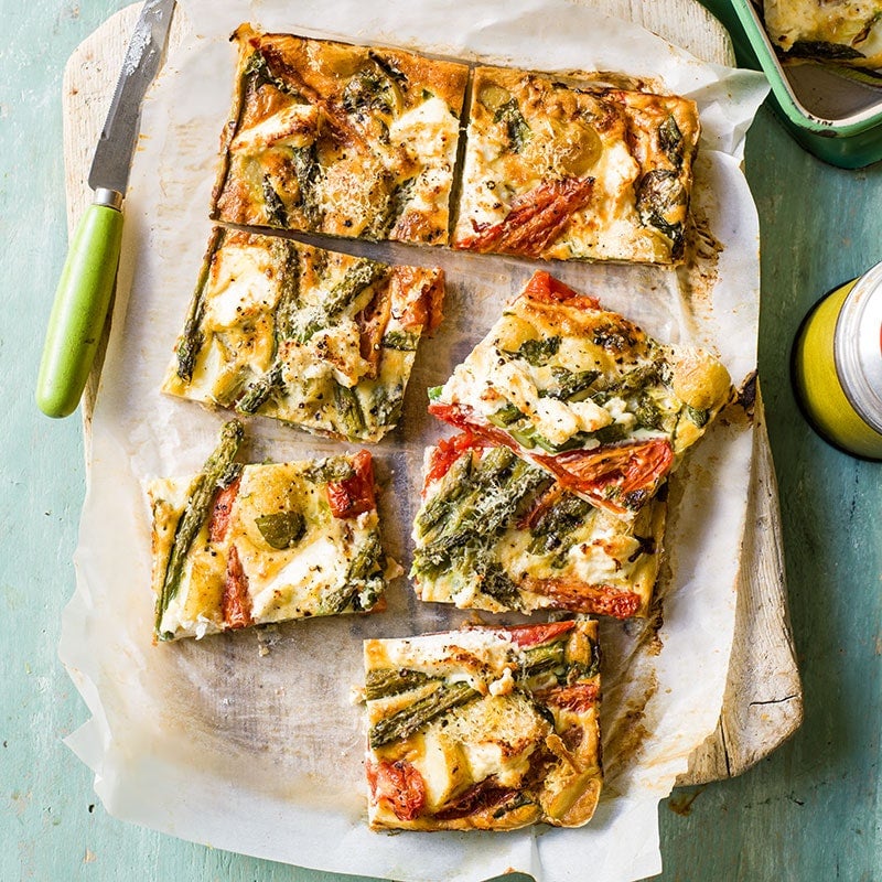 Bake for 15-20minutes or until golden and set. Set aside in tin to cool slightly, then use lining paper to lift slice from tin. Cut into 8 even pieces. Serve warm or cold.