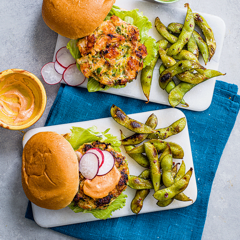 Prawn burgers with edamame pods