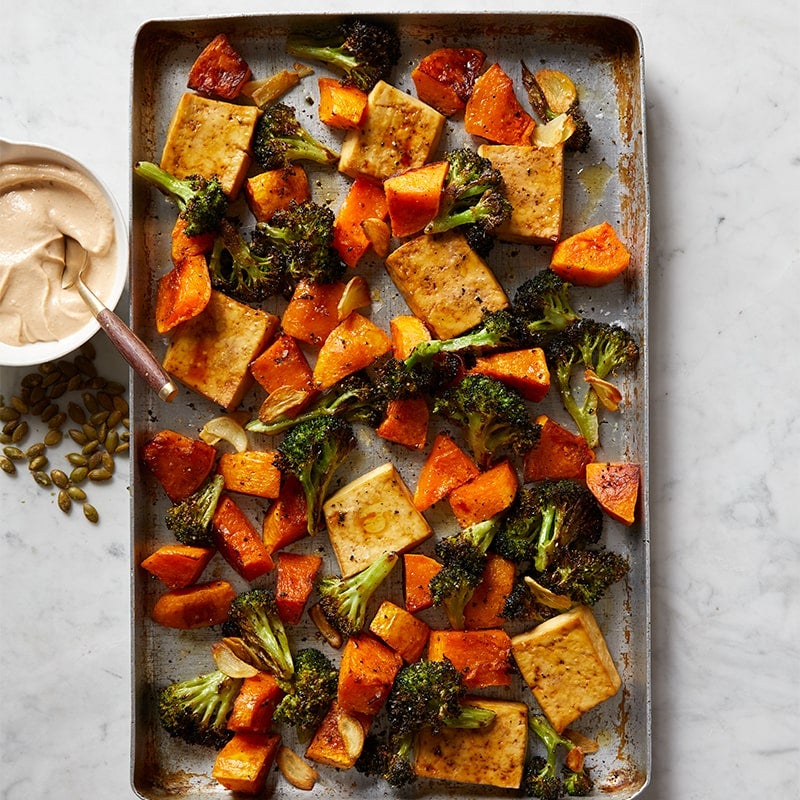 Roasted tofu, broccoli and pumpkin with creamy tahini tray bake