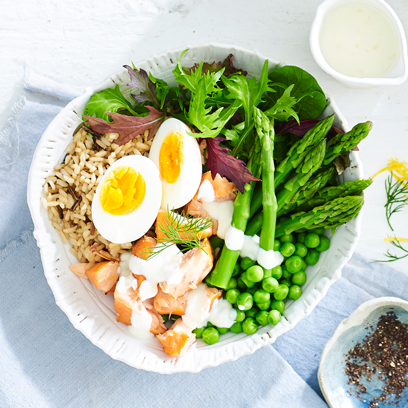 Arrange rice, asparagus, peas, salad leaves, salmon, egg and dill in serving bowls. Serve drizzled with yoghurt dressing.