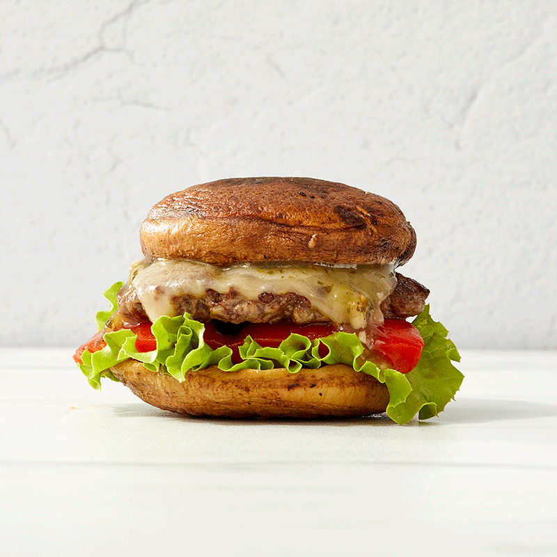 Place 6 mushroom caps, top-side down on a serving plate. Top each with a lettuce leaf, 1 capsicum piece, 1 patty and 1 teaspoon salsa verde. Place remaining mushroom caps on top.
