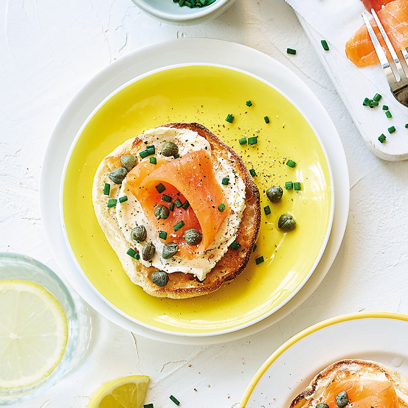 Spread muffin with cream cheese. Top with salmon. Serve sprinkled with capers and chives.