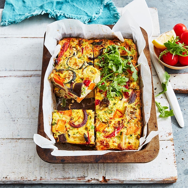Whisk eggs and cottage cheese in a large bowl until well combined. Add parsley, shallots, roasted vegetables and harissa paste. Season with salt and pepper and stir to combine. Pour mixture into prepared tin and smooth surface.