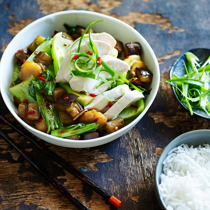 Meanwhile, heat a wok over high heat. Add oil and heat for 20 seconds. Stir-fry garlic, chilli and eggplant for 3–4 minutes or until golden. Add chestnuts and pak choy and stir-fry for 1–2 minutes or until heated through. Stir in half the soy sauce.