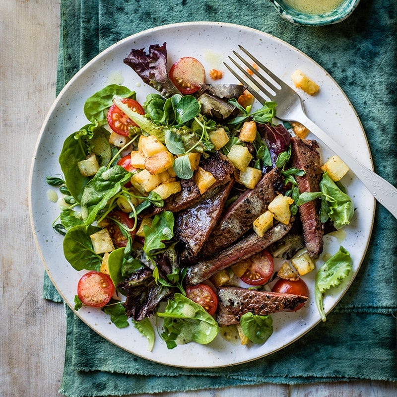 With its Dijon dressing and crispy potatoes, this healthier version of steak and chips is sure to win over the family.