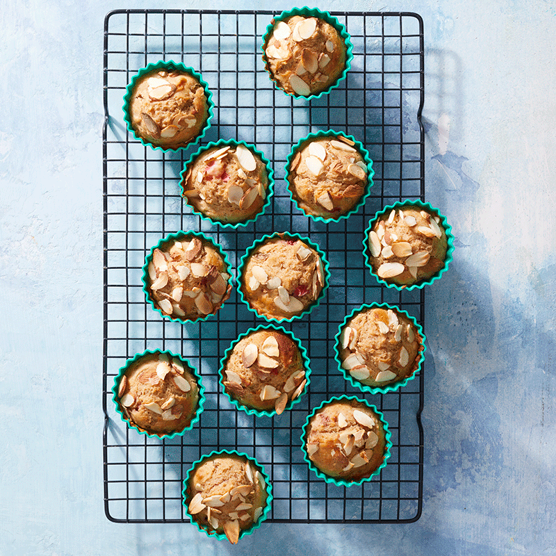 Bake for 20 minutes or until a skewer inserted into the centre of the muffins comes out clean. Stand muffins in the moulds for 10 minutes, then remove and transfer to a wire rack to cool.