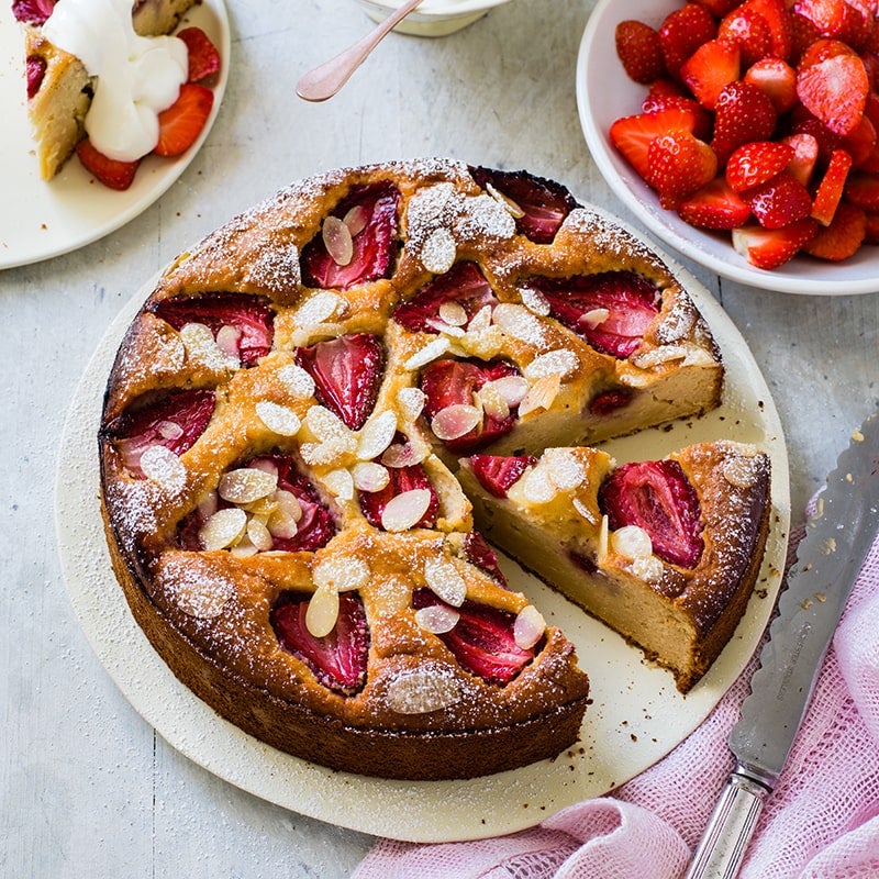 Sift flour and baking powder into a medium bowl. Fold flour mixture, vanilla and almond extract into bean mixture. Pour into prepared tin. Arrange strawberries, cut side up, on top. Sprinkle with flaked almonds.