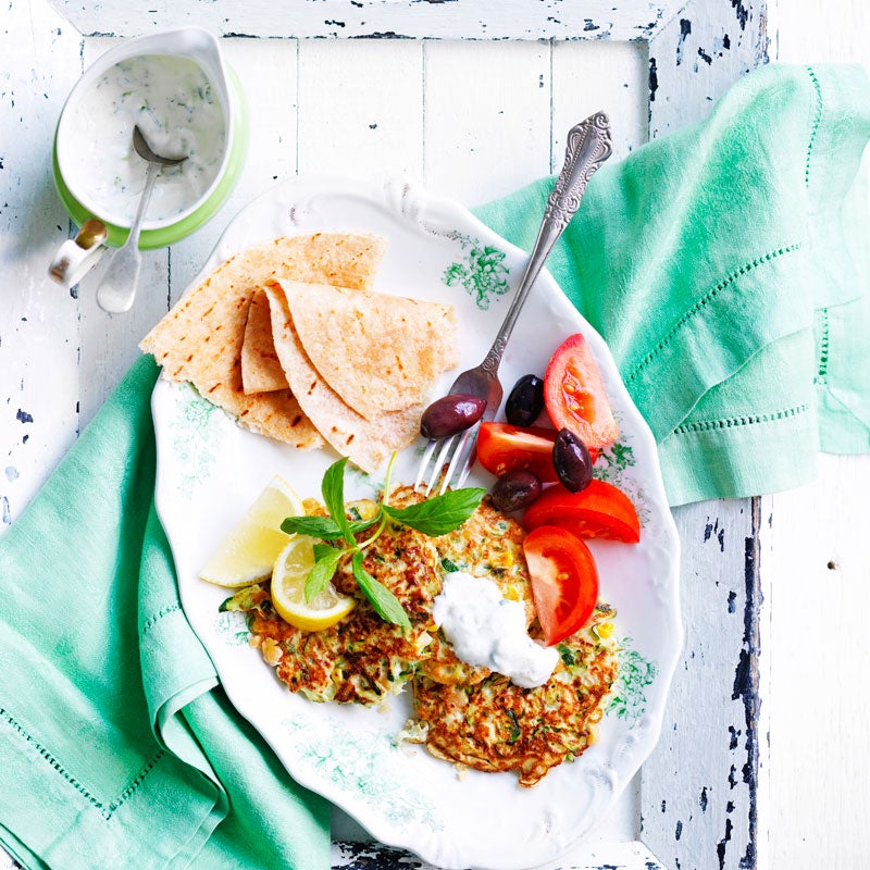 Sweet corn and zucchini fritter mezze platter