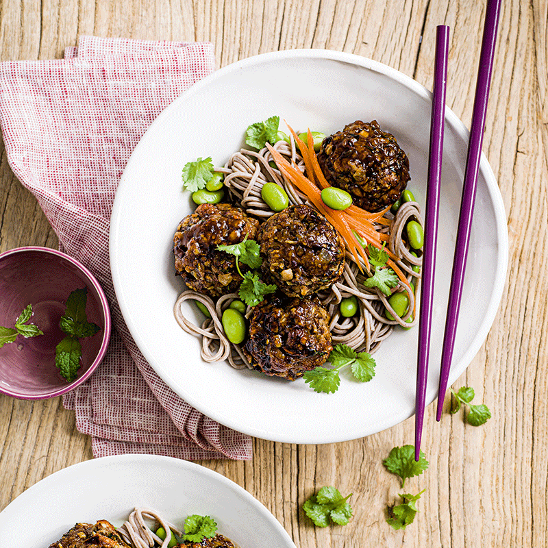 Teriyaki mushroom 'meatballs' with soba noodles