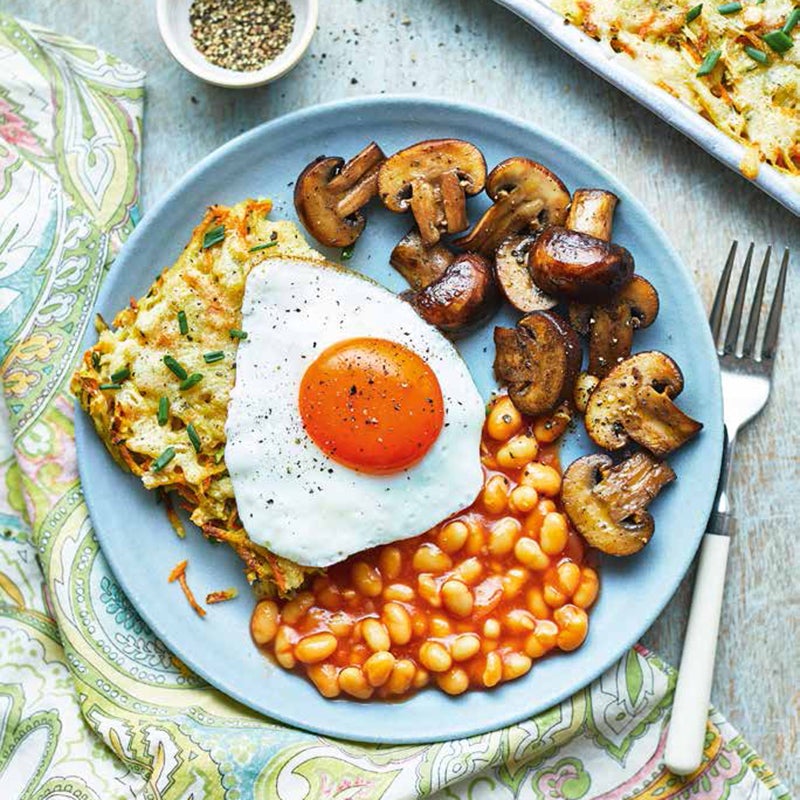 Cut hash brown into 6 pieces. Top each with a fried egg and sprinkle with freshly ground black pepper and chives. Serve with mushrooms and beans on the side.