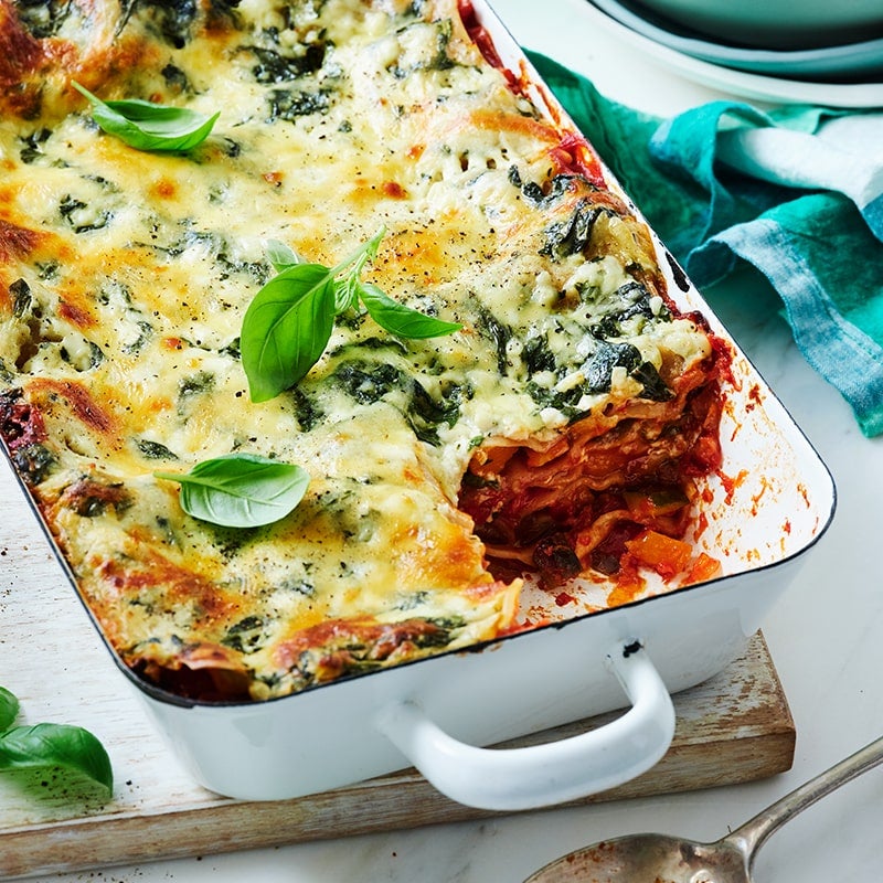 Spread 1 cup of the vegetable mixture over the base of a 32cm x 20cm (12-cup capacity) rectangular baking dish. Top with a layer of lasagne sheets and spread with ¼ of the remaining vegetable mixture. Repeat layers with remaining lasagne sheets and vegetable mixture to make 4 layers in total, finishing with a layer of lasagne sheets. Spread cottage cheese mixture over top and sprinkle with mozzarella. Bake for 40-45 minutes or until pasta is tender when tested with the tip of a knife. Stand lasagne for 10 minutes before serving. Sprinkle over fresh basil leaves to serve.