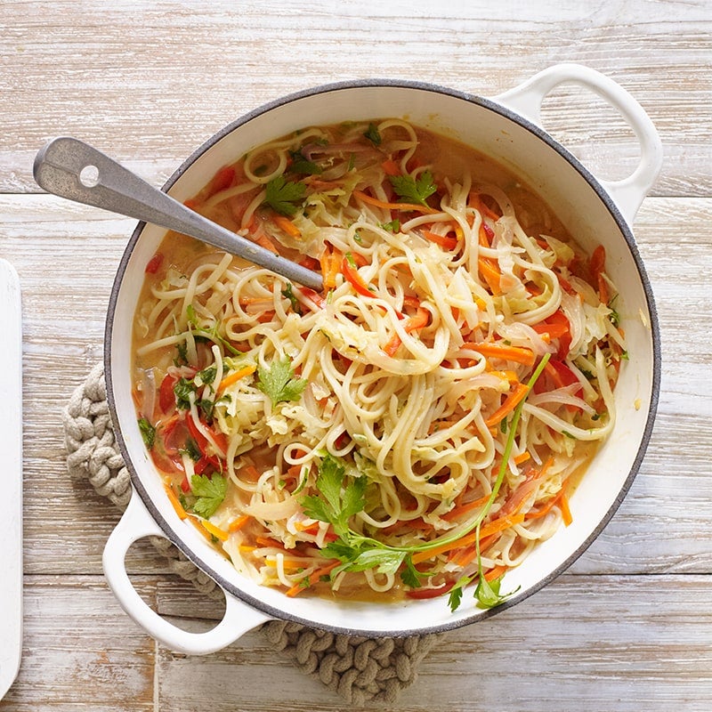 Combine linguine, capsicum, carrot, onion, curry paste, ginger, stock and coconut milk in a large, deep pot or saucepan and bring to the boil over high heat. Gently boil, uncovered, for 8 minutes, stirring and turning linguine frequently with tongs.