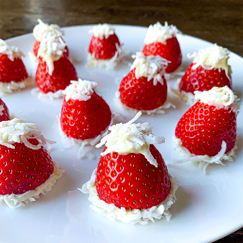 Microwave chocolate in a small heatproof bowl in 15 second bursts on High (100%), stirring until smooth and melted. Place coconut in a medium bowl. Dip both ends of strawberries into melted chocolate, then dip into coconut to coat chocolate. Return strawberries to plate with larger end of the strawberries facing down. Refrigerate for 1 hour, or until chocolate is set.